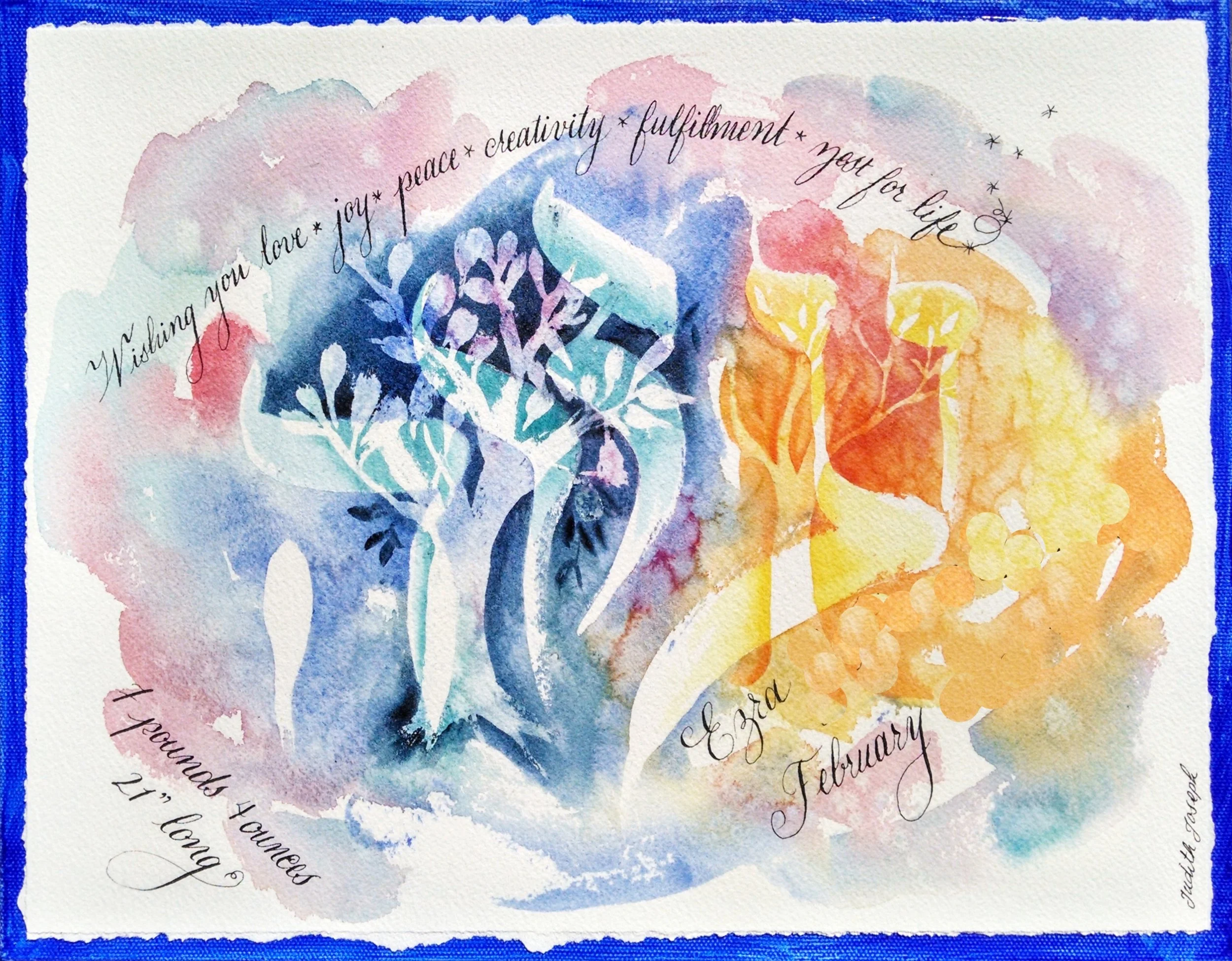 Consult with artist Judith Joseph to create personalized, custom art for a baby-naming, bar/ bat mitzvah, confirmation or any milestone.
